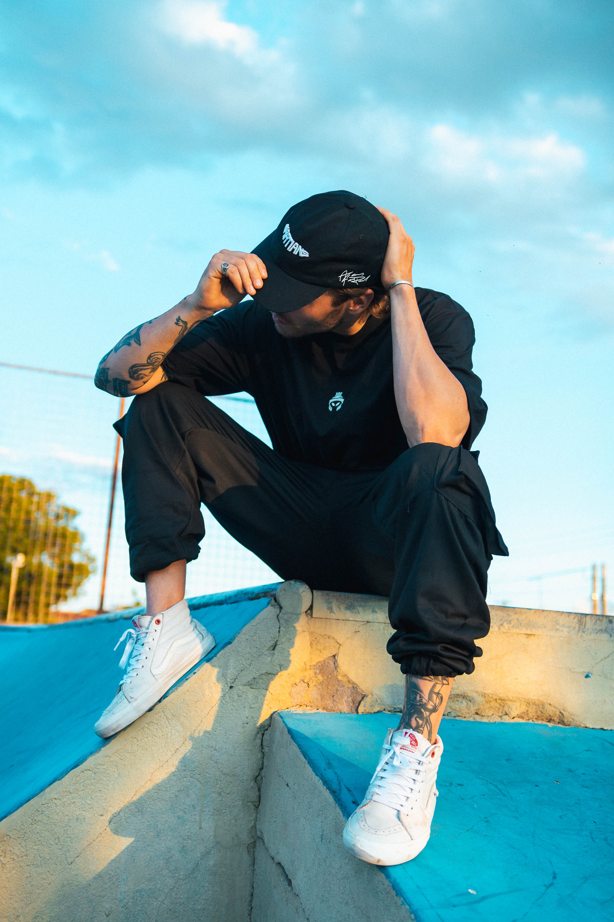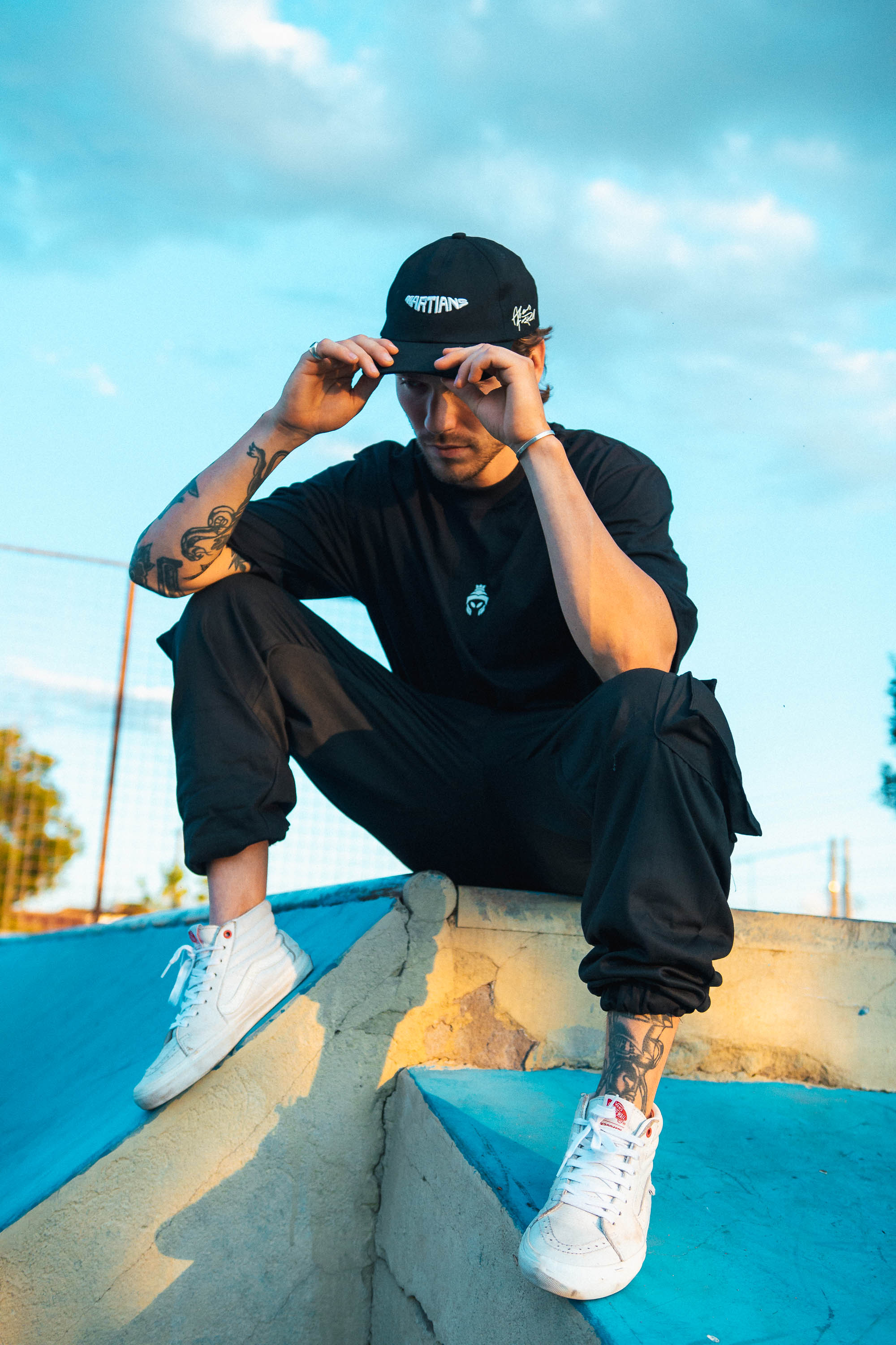 Boné Dad Hat preto minimalista com logo “MARTIANS“ em bordado frontal de alto relevo. Design clean com assinatura lateral, ajuste personalizável e acabamento premium em algodão. A essência do streetwear contemporâneo em um acessório atemporal.