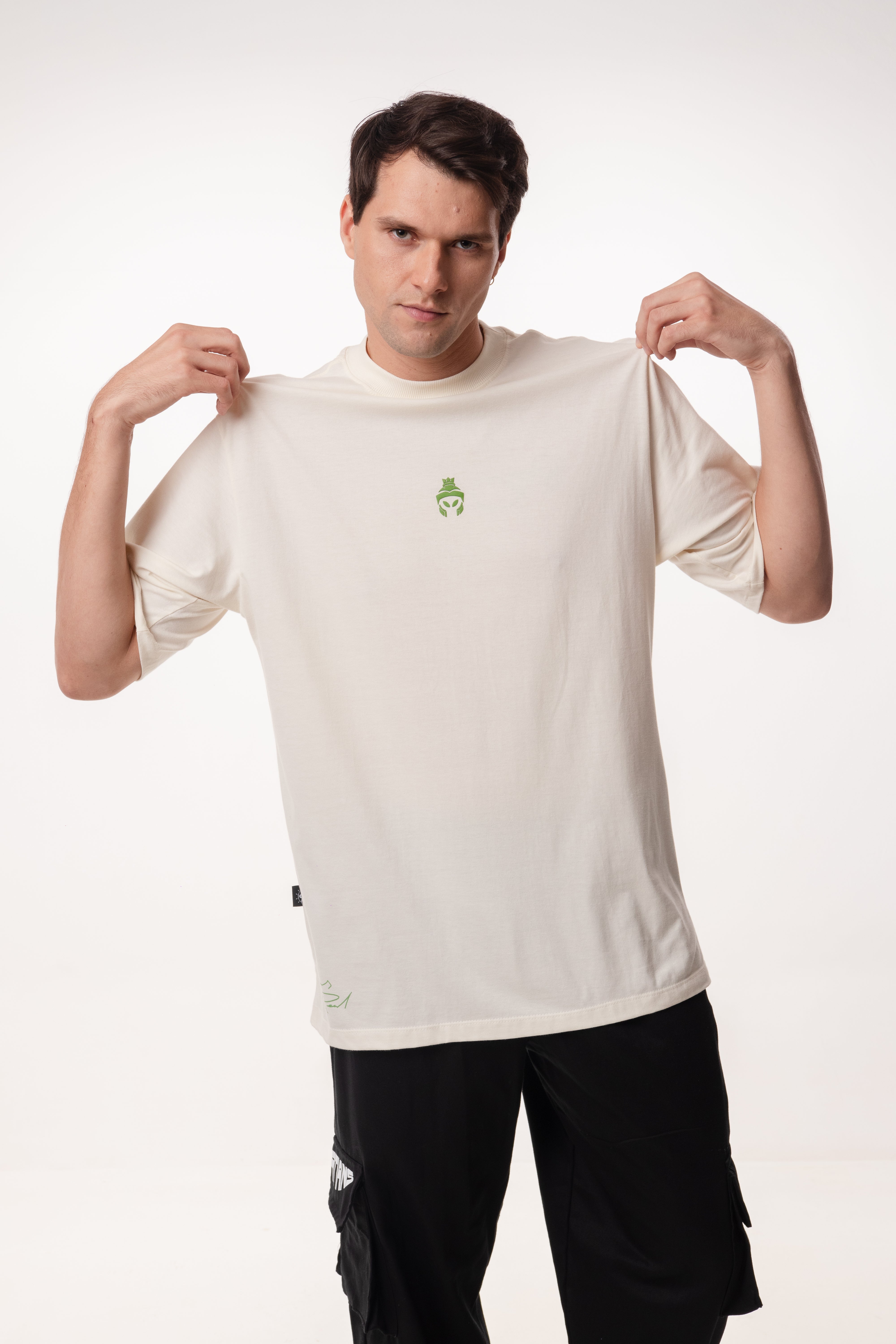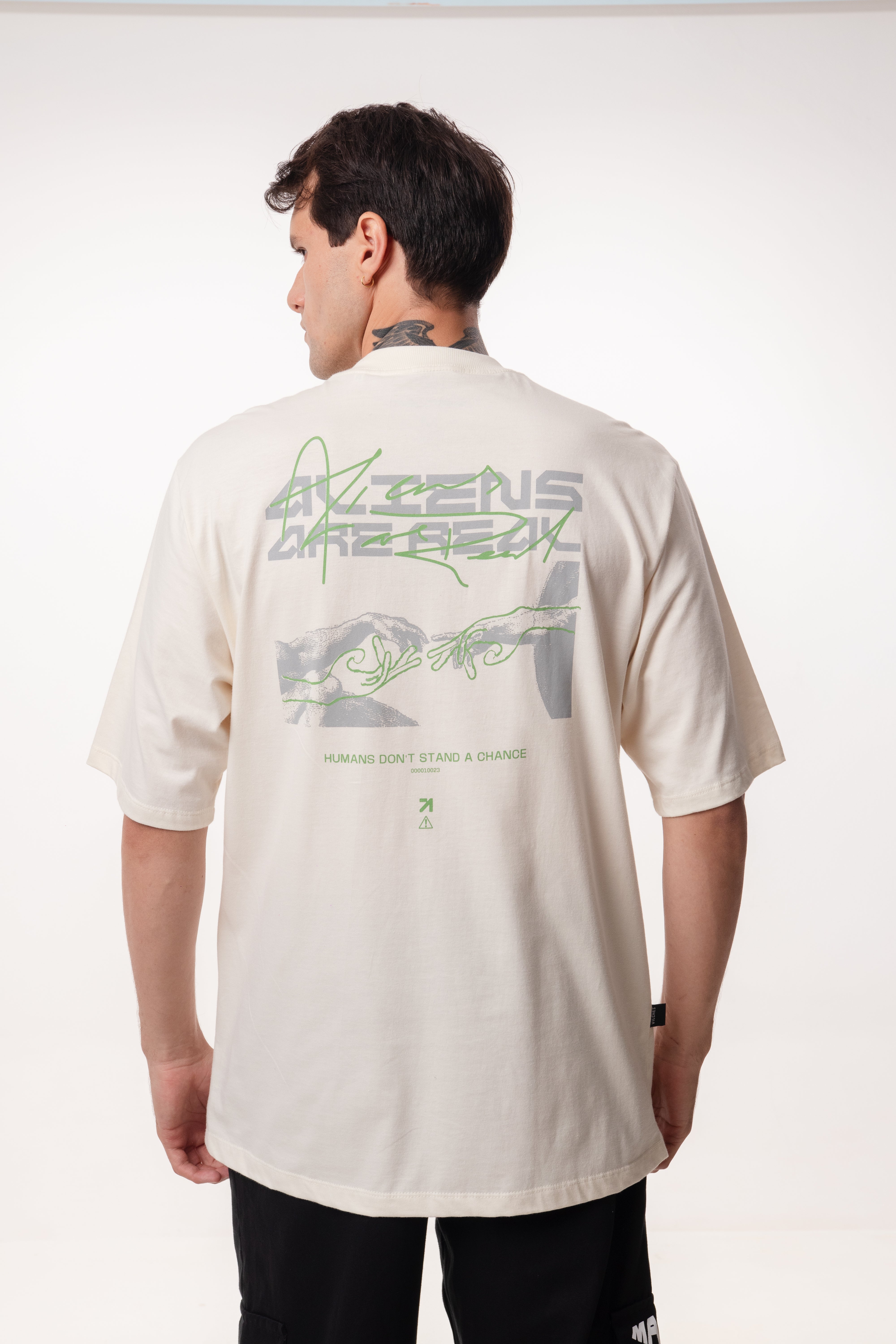 Camiseta com modelagem oversized seguindo as principais tendências do streetwear mundial. Arte exclusiva "CREATION OF ALIENS" e logo "MARTIANS" aplicados com técnica zero toque. Confeccionada em malha premium 100% algodão, na cor off-white com detalhes em verde, traz o fit perfeito pra qualquer ocasião.