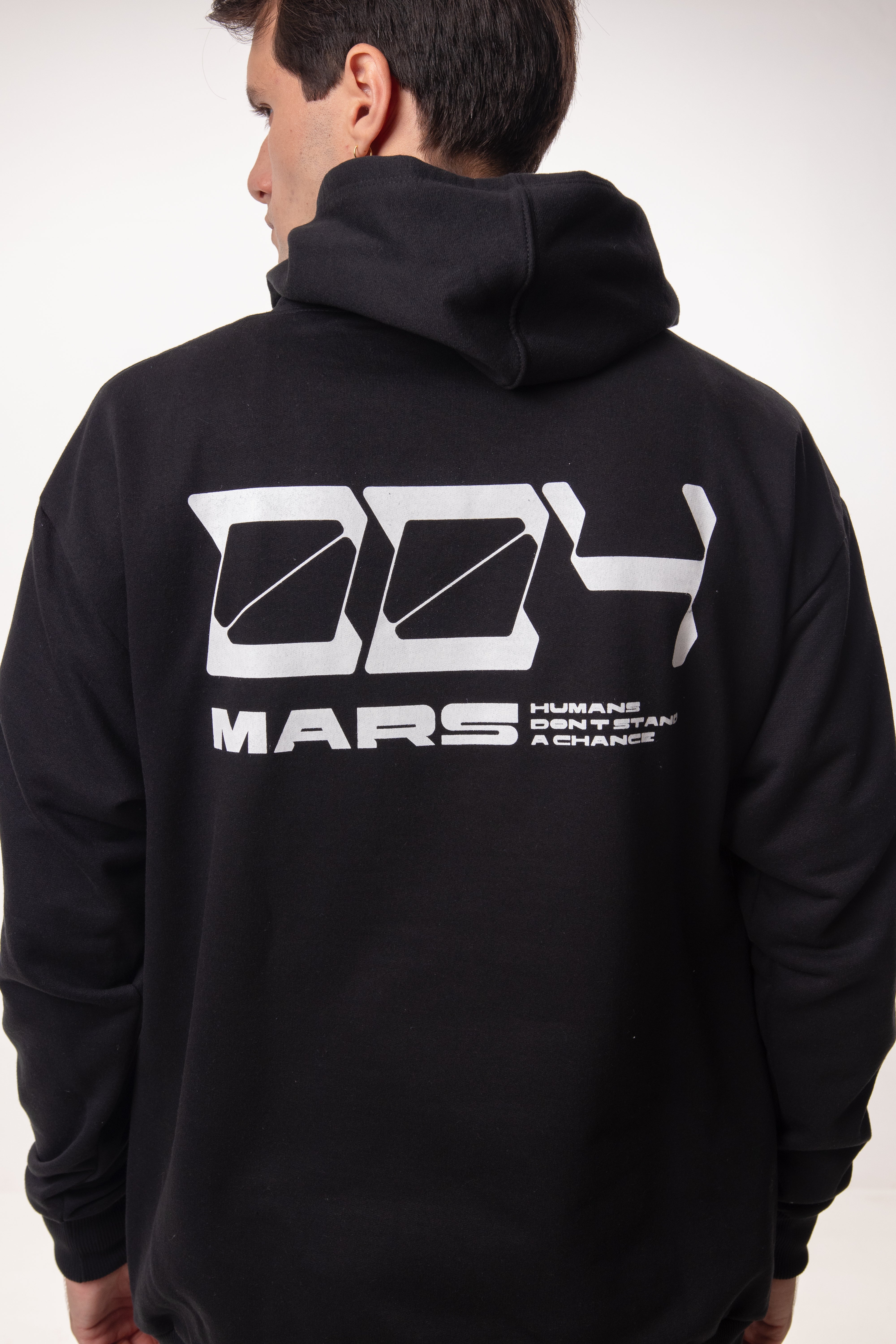Moletom Hoodie "004" preto minimalista com logo "MARTIANS" em silkscreen frontal e arte conceitual nas costas. Design clean com assinatura lateral e acabamento premium em moletom felpado. A essência do streetwear contemporâneo em uma peça atemporal.